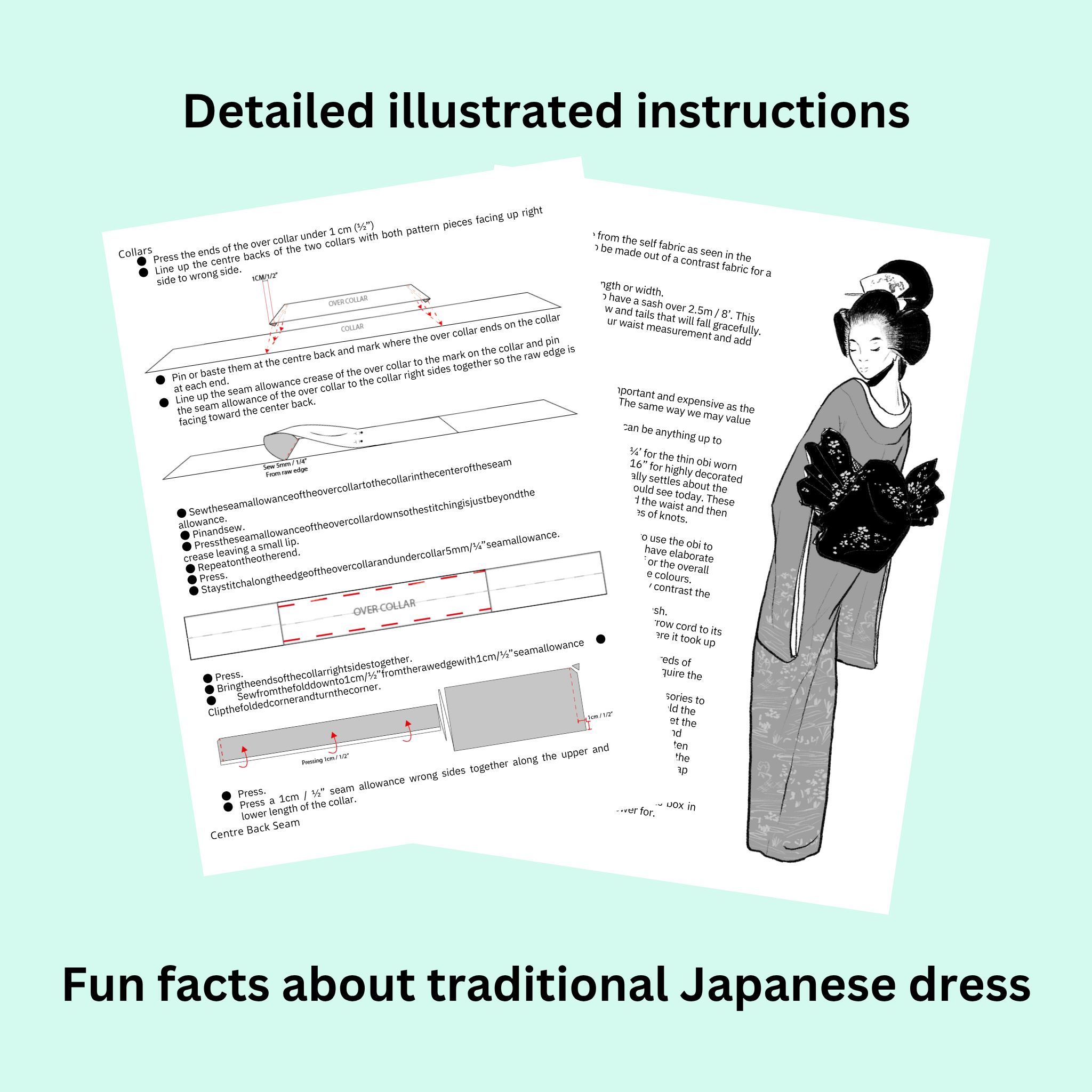 Detailed illustrated instructions for Kimono Sewing Pattern Set showing garment construction guidance.