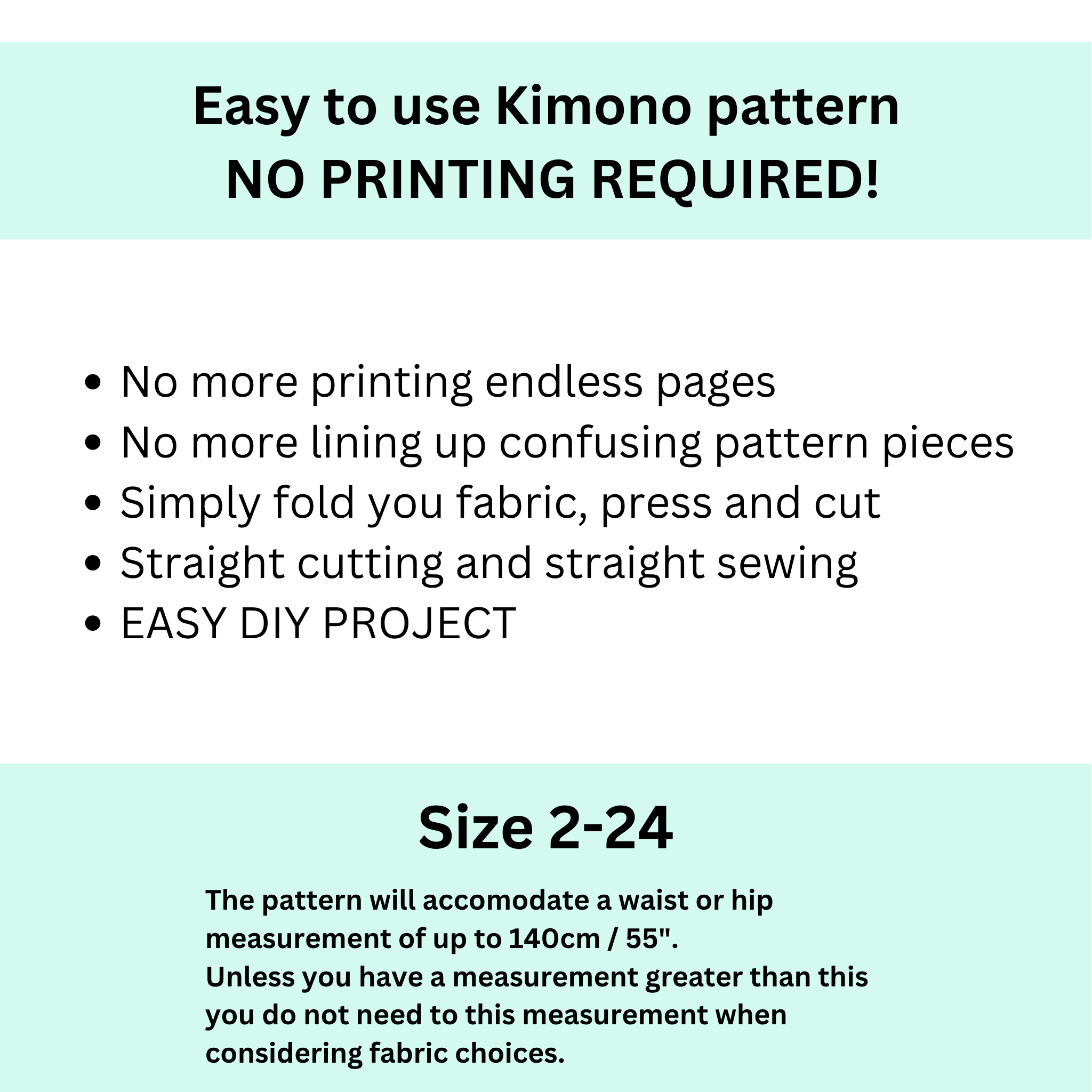 Sew your own traditional Kimono with this easy kimono sewing pattern. This is the essential kimono robe pattern—a full-length garment with wide sleeves and an open wrap front—adapted from Japanese design but simplified for modern fabrics and a home sewing machine.