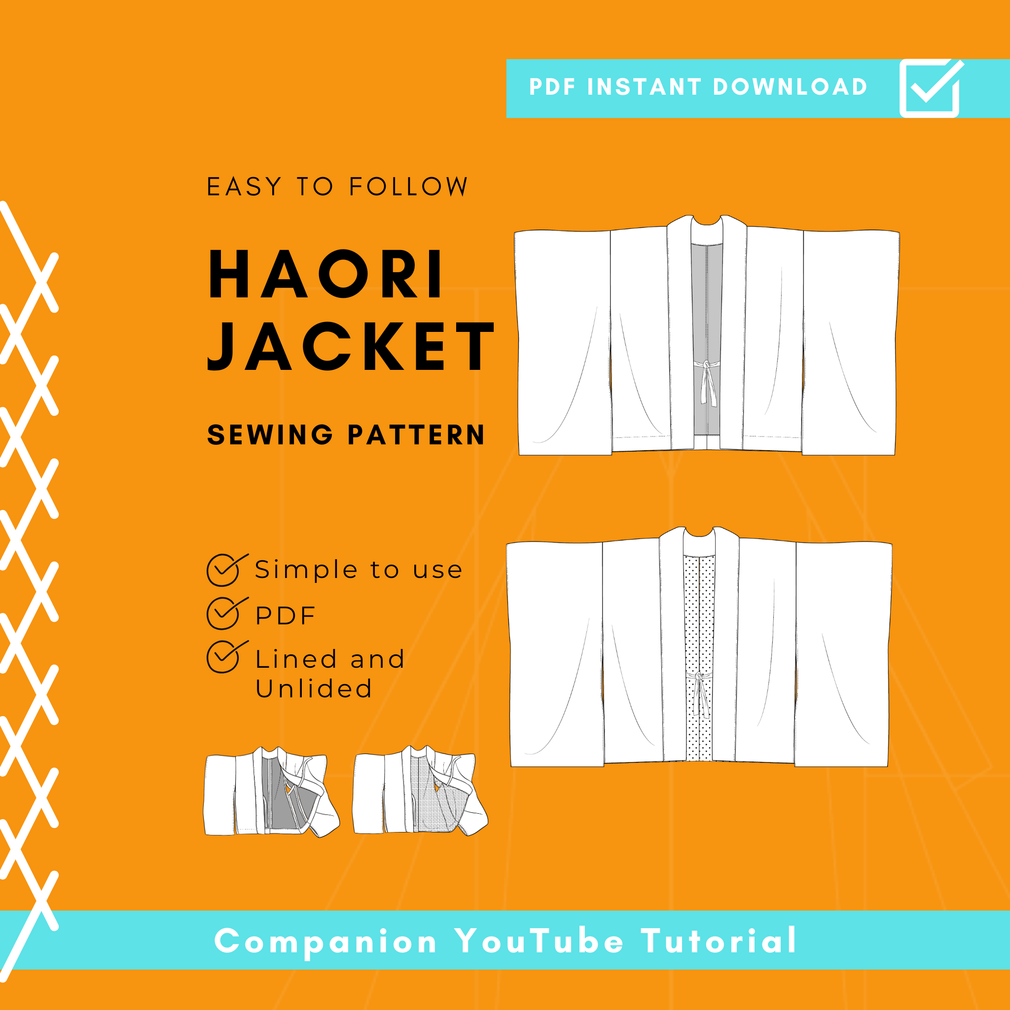Create your own traditional Haori jacket with this beginner-friendly haori sewing pattern. The haori, often called a kimono jacket, is a versatile open-front layer with wide sleeves and a relaxed fit. This pattern includes both lined and unlined options, so you can make a lightweight everyday haori or a fully lined version with a more formal finish.